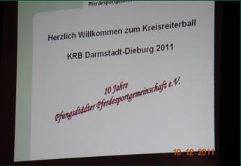 Kreisreiterball 2011 der Pfungstädter PSGKreisreiterball der Pfungstädter PSG in der Wagenhalle Griesheim Anlässlich des 10-jährigen Vereinsjubiläums der Pfungstädter Pferde Sport Gemeinschaft fand dieses Jahr der Kreisreiterball am 10. Dezember 2011 in der Wagenhalle in Griesheim statt. An diesem gesellschaftlichen Highlight wurden die Kreismeister des KRB Darmstadt-Dieburg geehrt.Sie haben über die Turniersaison mit ihren Erfolgen Punkte gesammelt und beim letzten Kreismeisterschafts-Turnier in Traisa standen die Sieger fest. In festlicher Abendgarderobe feierten die Gäste begleitet von der 6-köpfigen Barney-Jackson-Band.